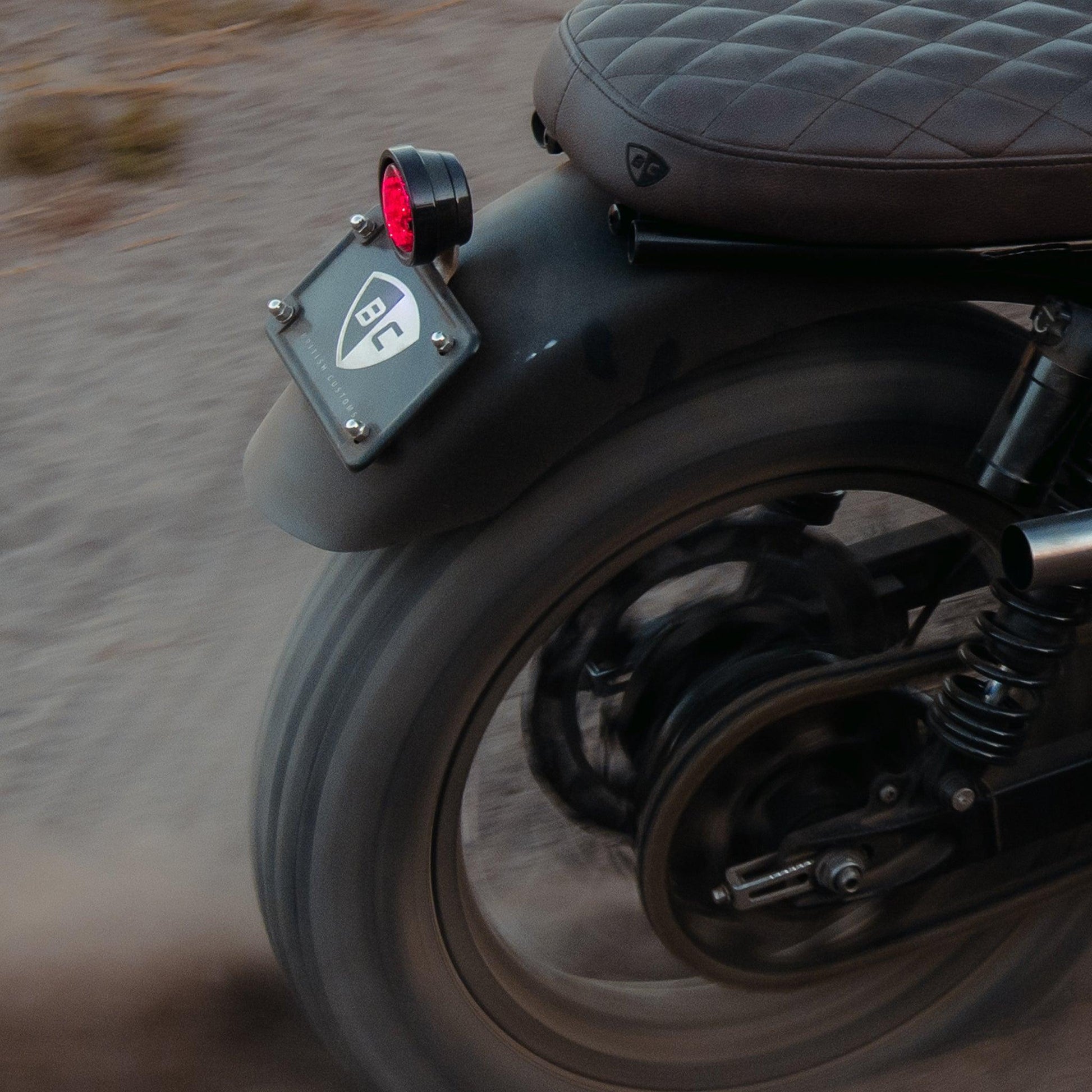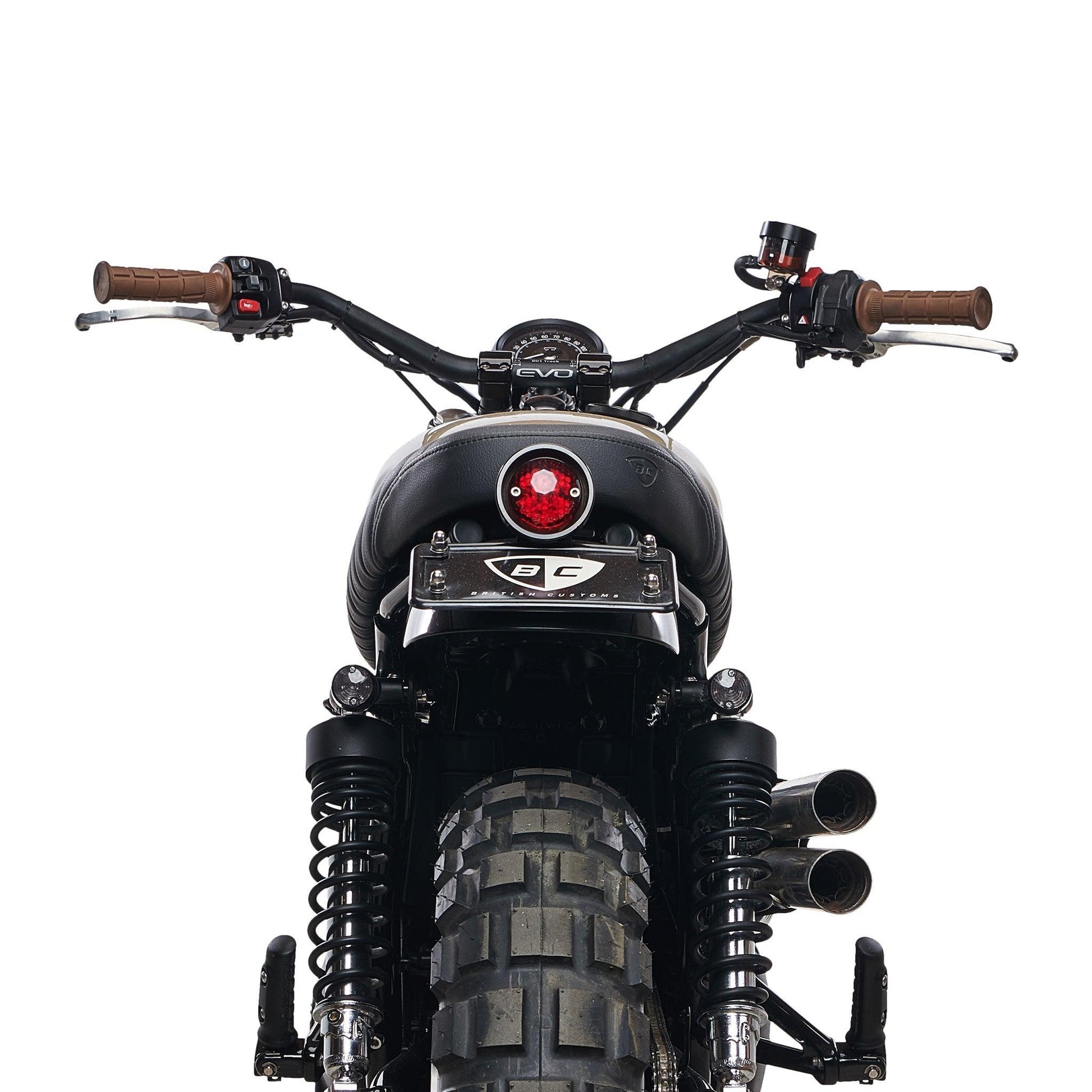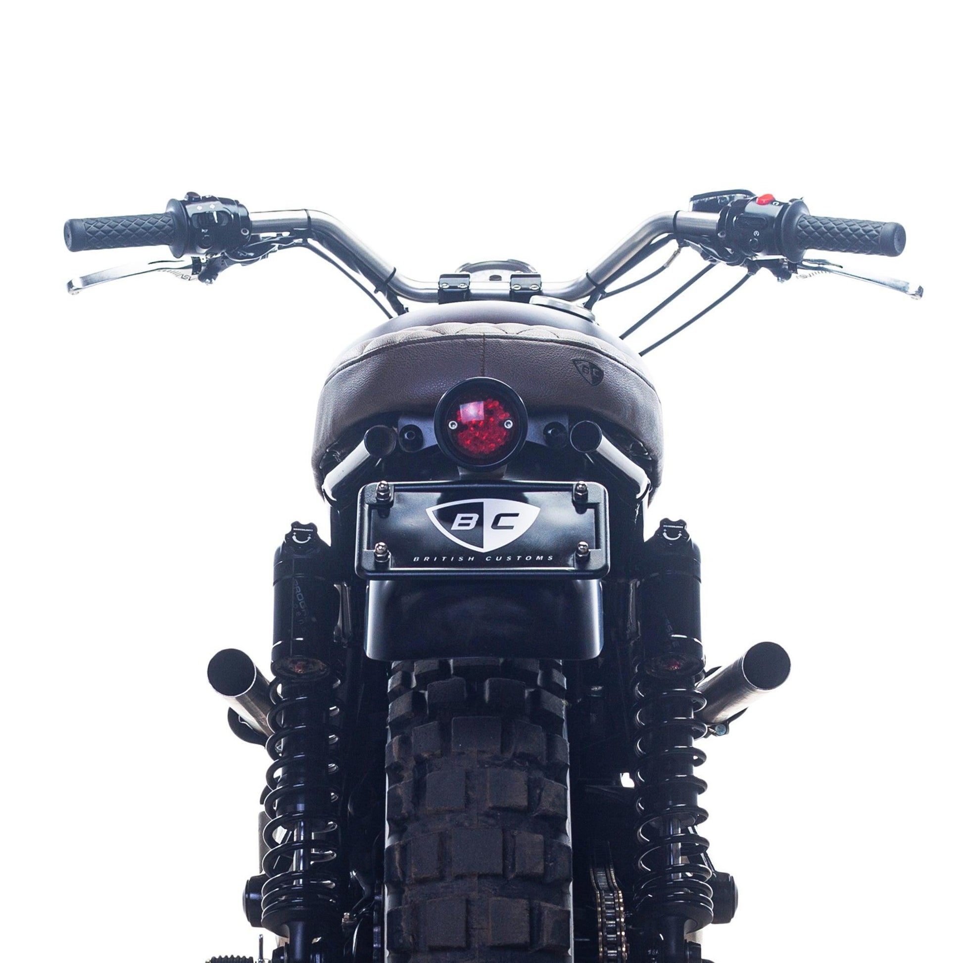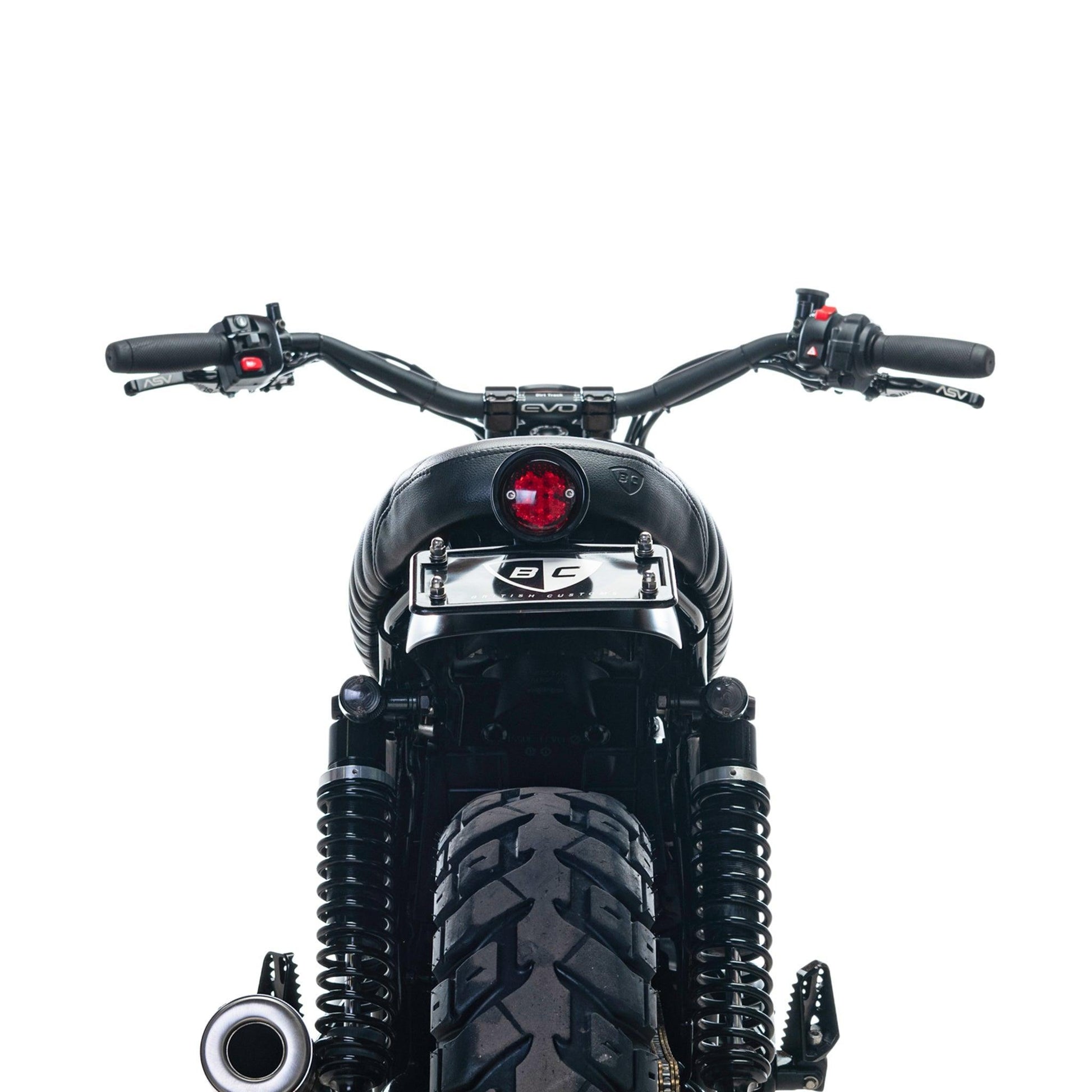 The British Customs Pan Tail Light body is machined from 6061 aluminum, all machine marks are polished out and then finished in black anodized finish. The license/ taillight mounting bracket is laser custom from stainless steel and powder coated in satin black finish. The round LED tail light with built in license plate illumination lights. Our proprietary wiring harness, license plate frame and stainless steel mounting hardware are all included.