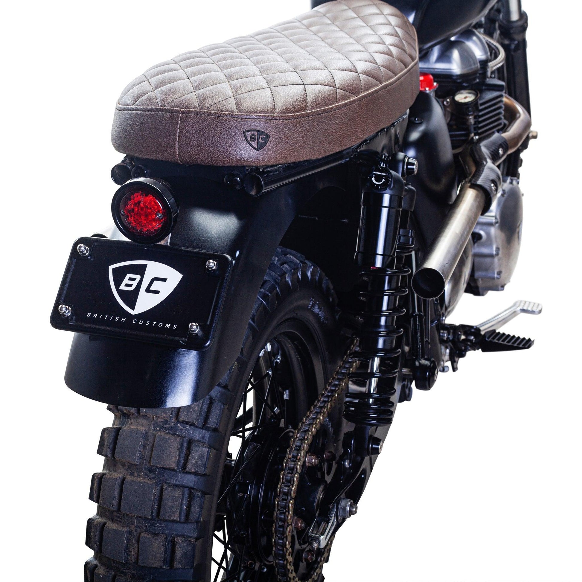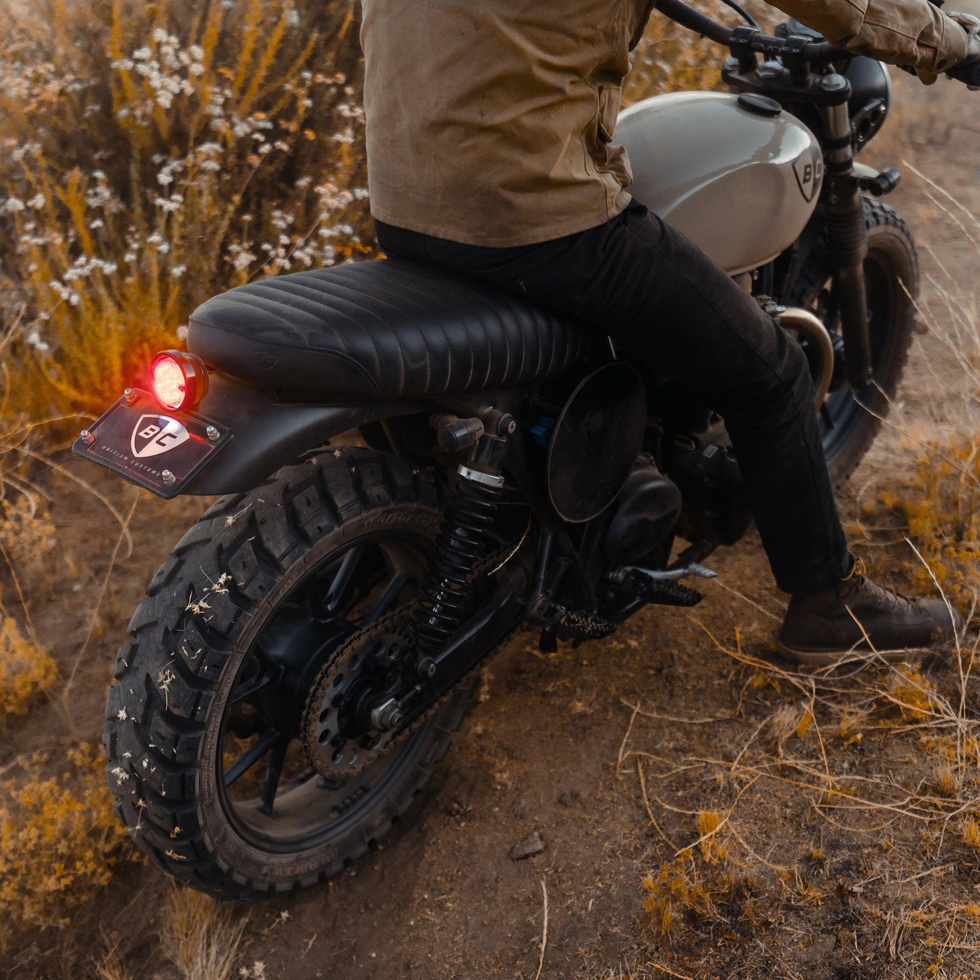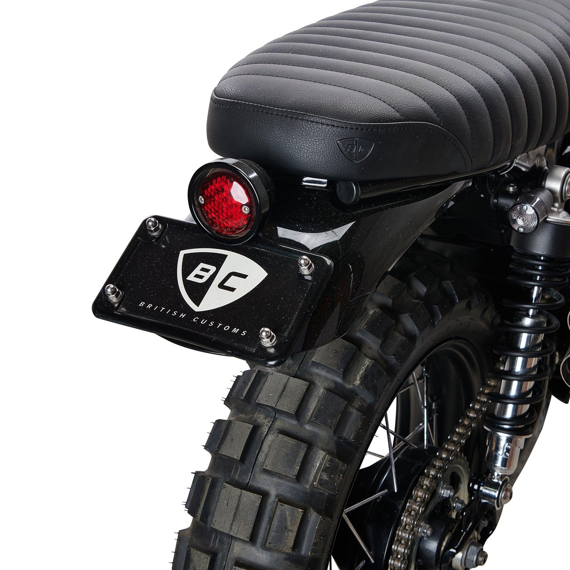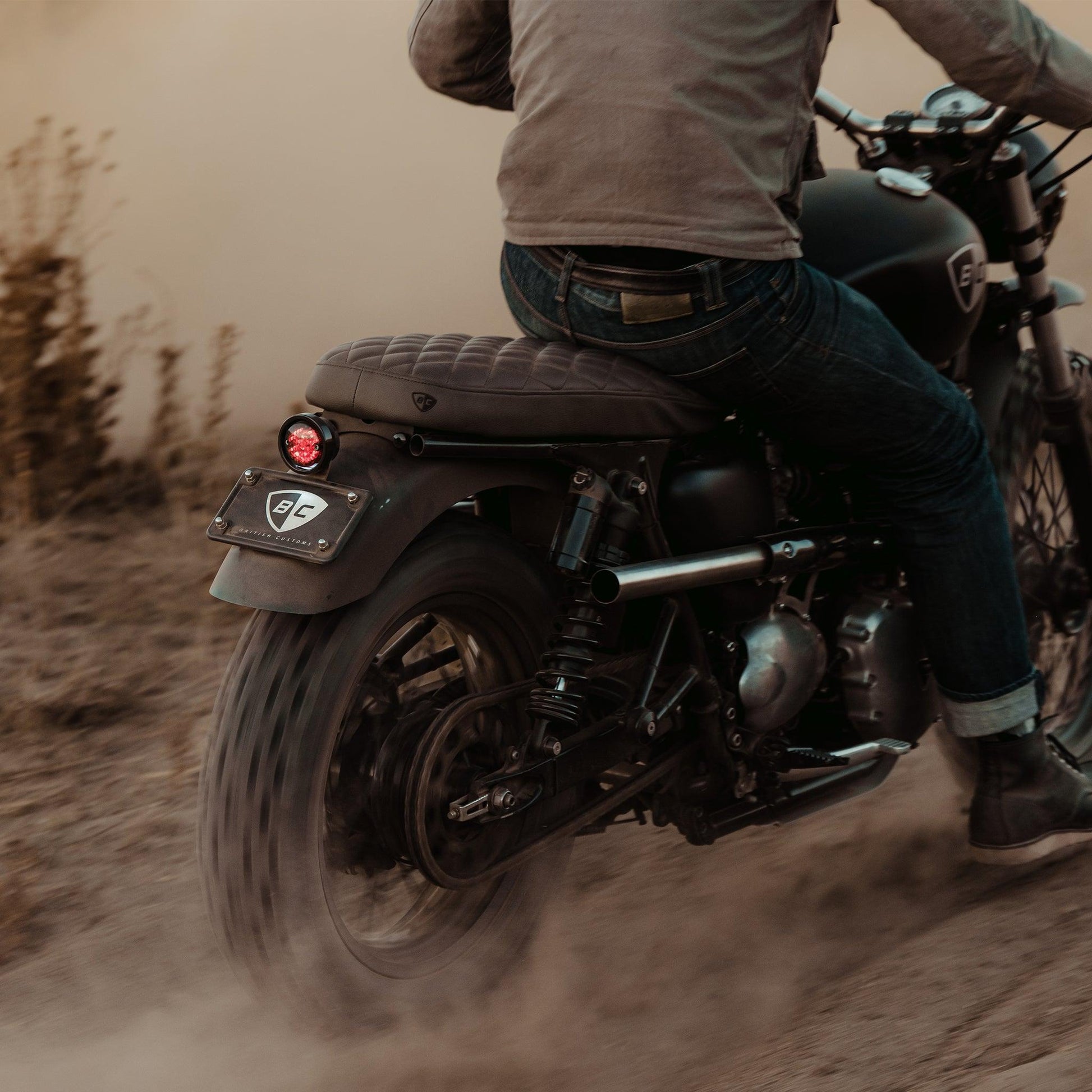 The British Customs Pan Tail Light body is machined from 6061 aluminum, all machine marks are polished out and then finished in black anodized finish. The license/ taillight mounting bracket is laser custom from stainless steel and powder coated in satin black finish. The round LED tail light with built in license plate illumination lights. Our proprietary wiring harness, license plate frame and stainless steel mounting hardware are all included.