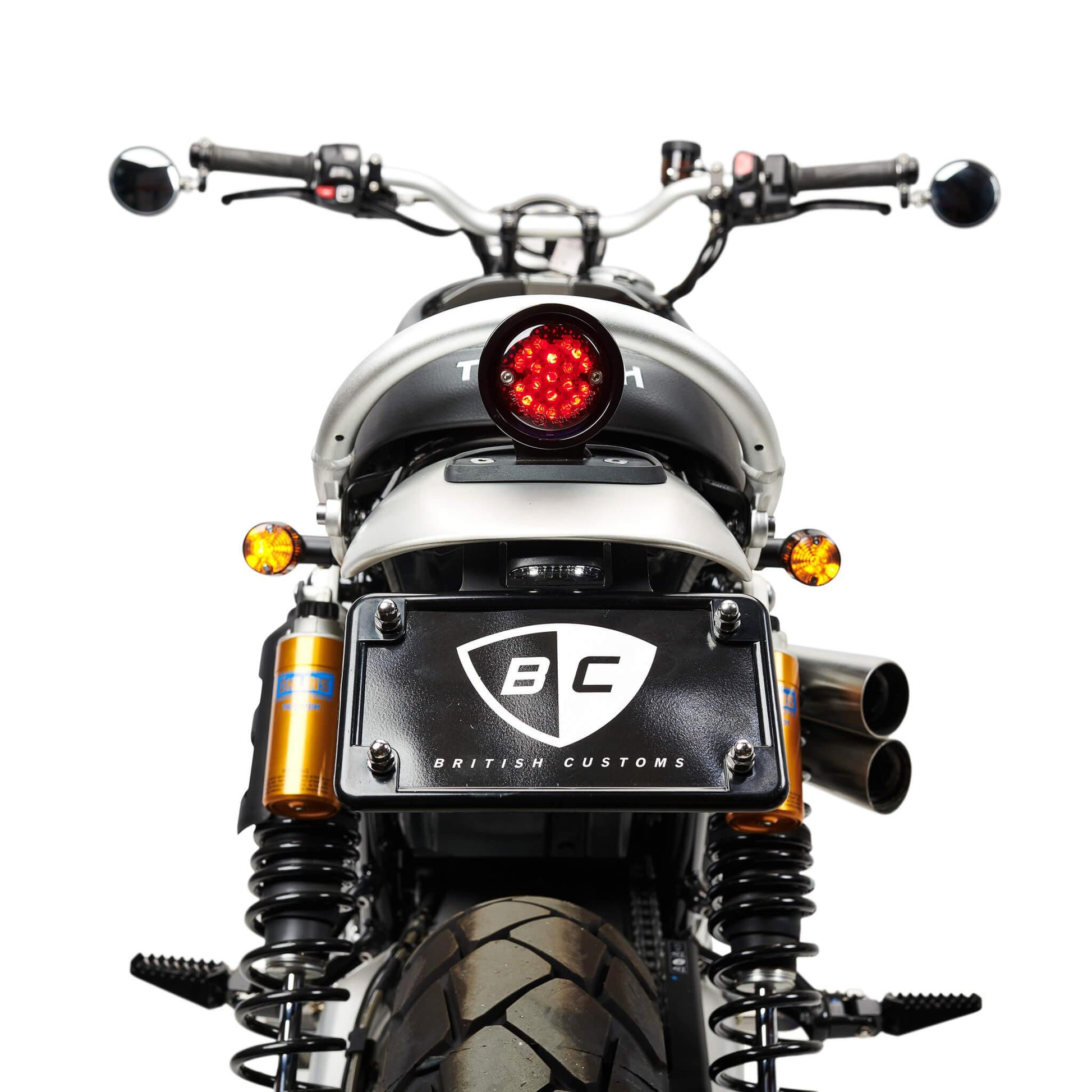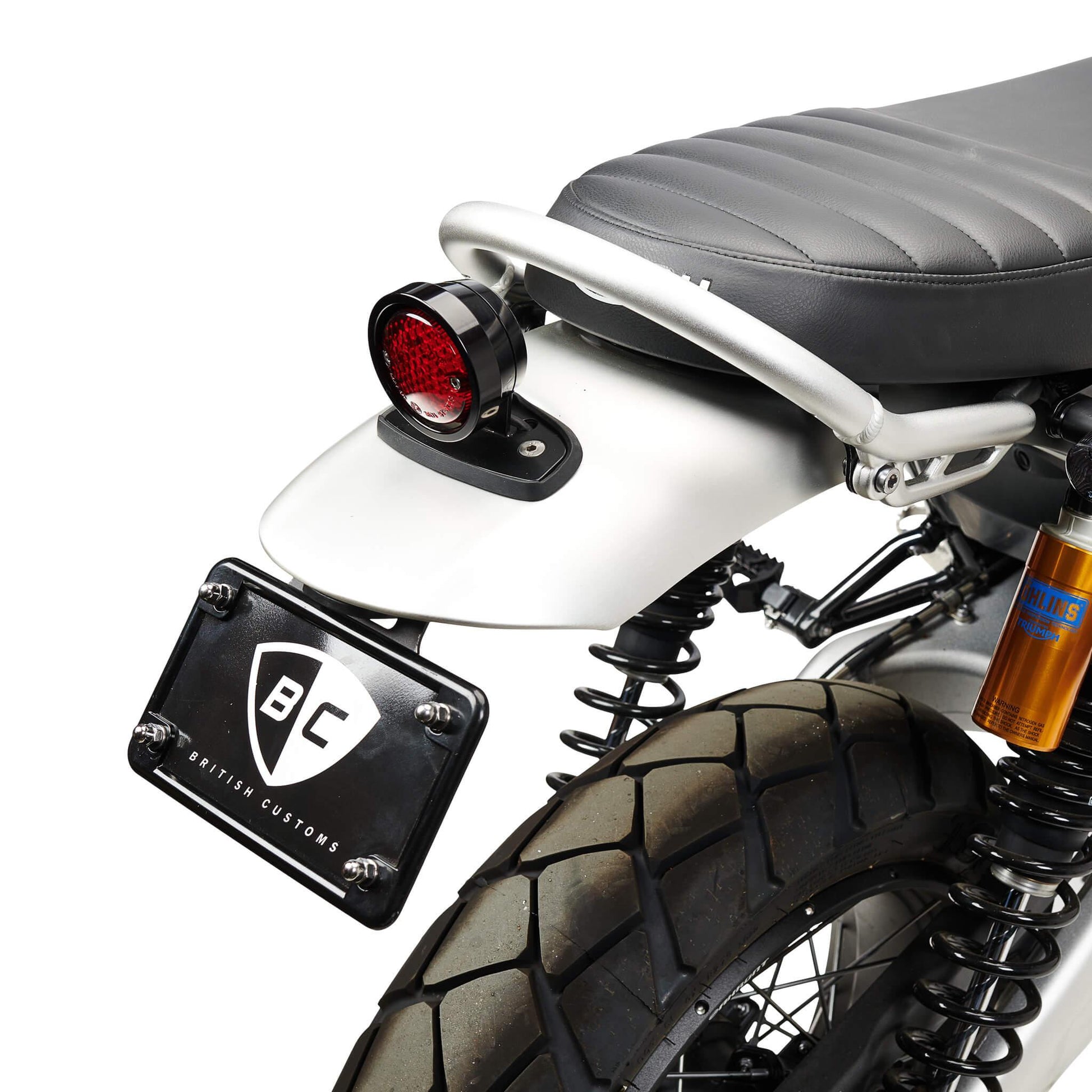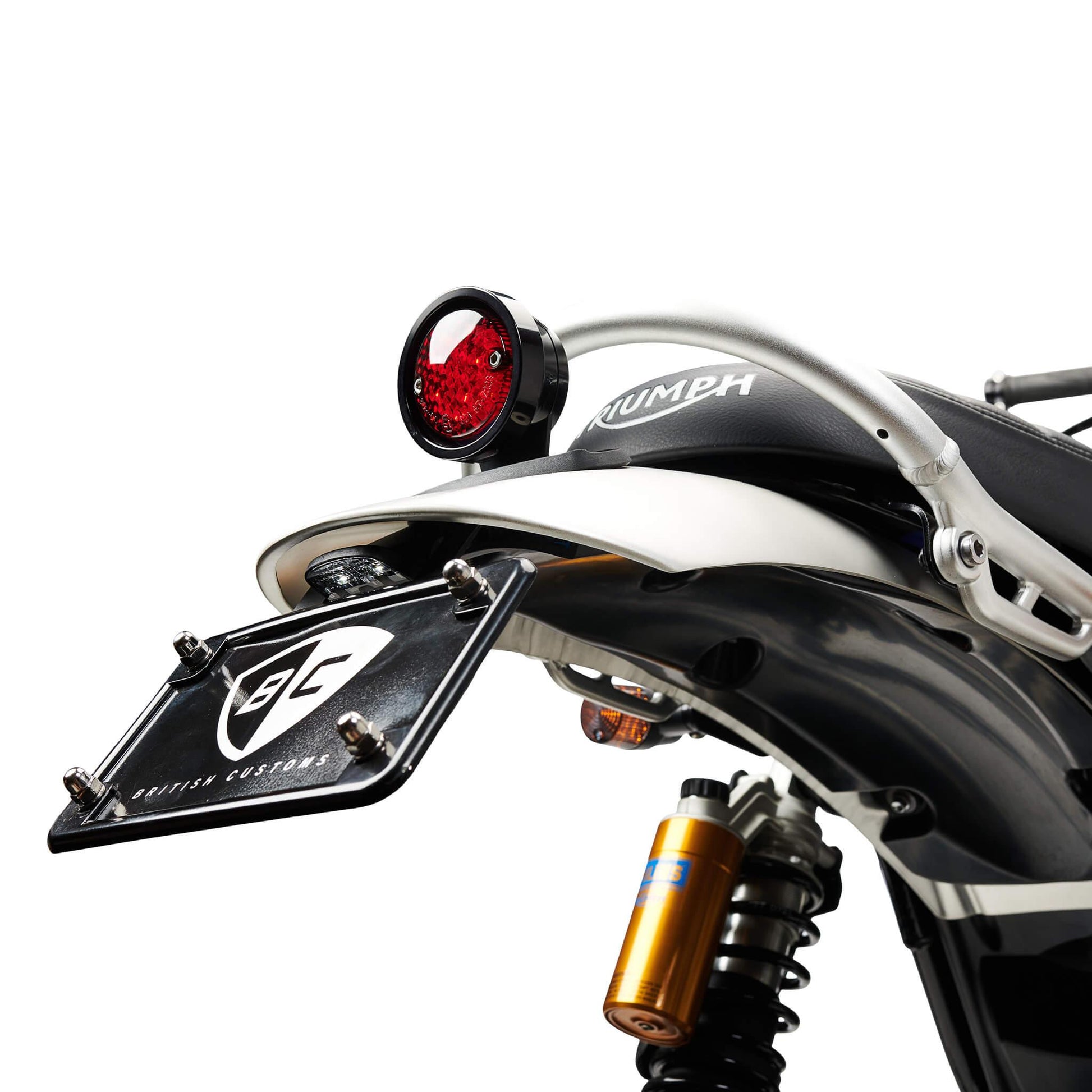 Introducing the British Customs Plug & Play Pan Tail Light for Triumph Scrambler 1200 XC/XE. Our team has developed a bracket for the Pan Tail Light housing that mounts to the rear fender using factory mounting points. Ensuring easy installation with no drilling or modification required.