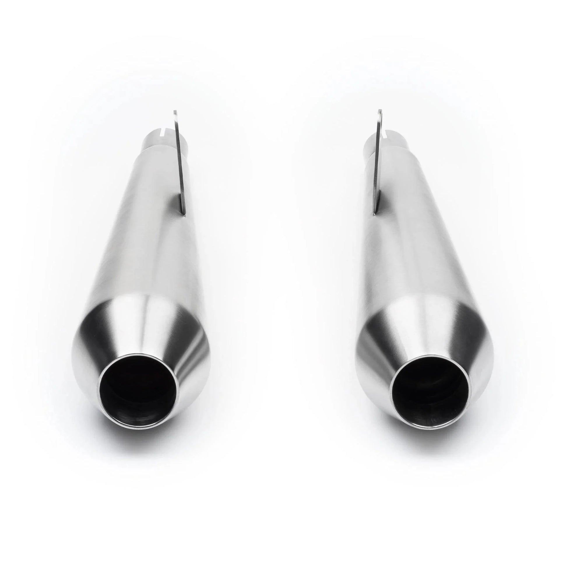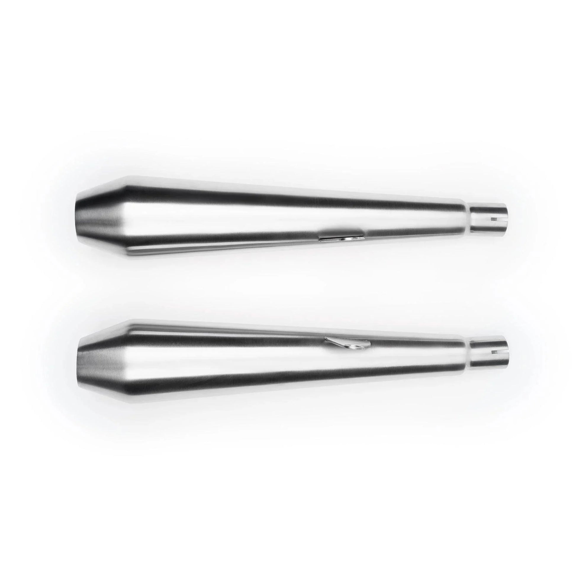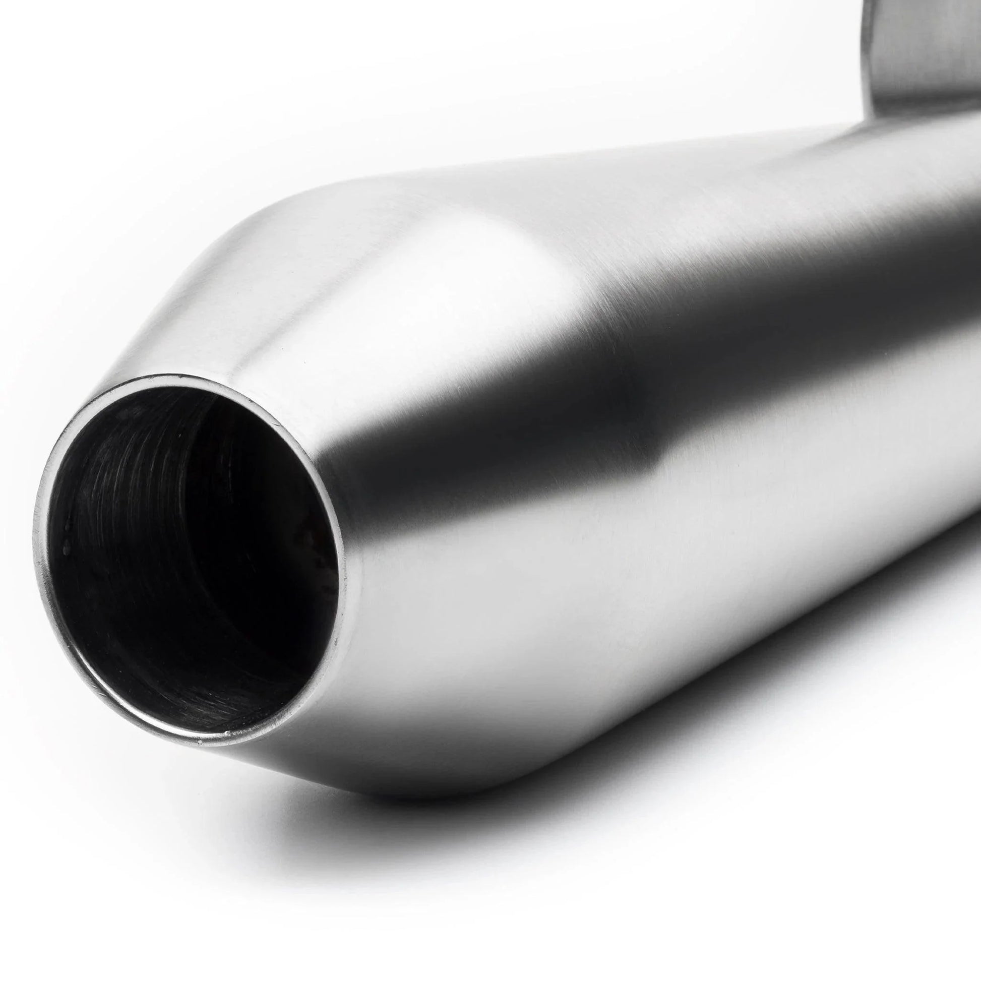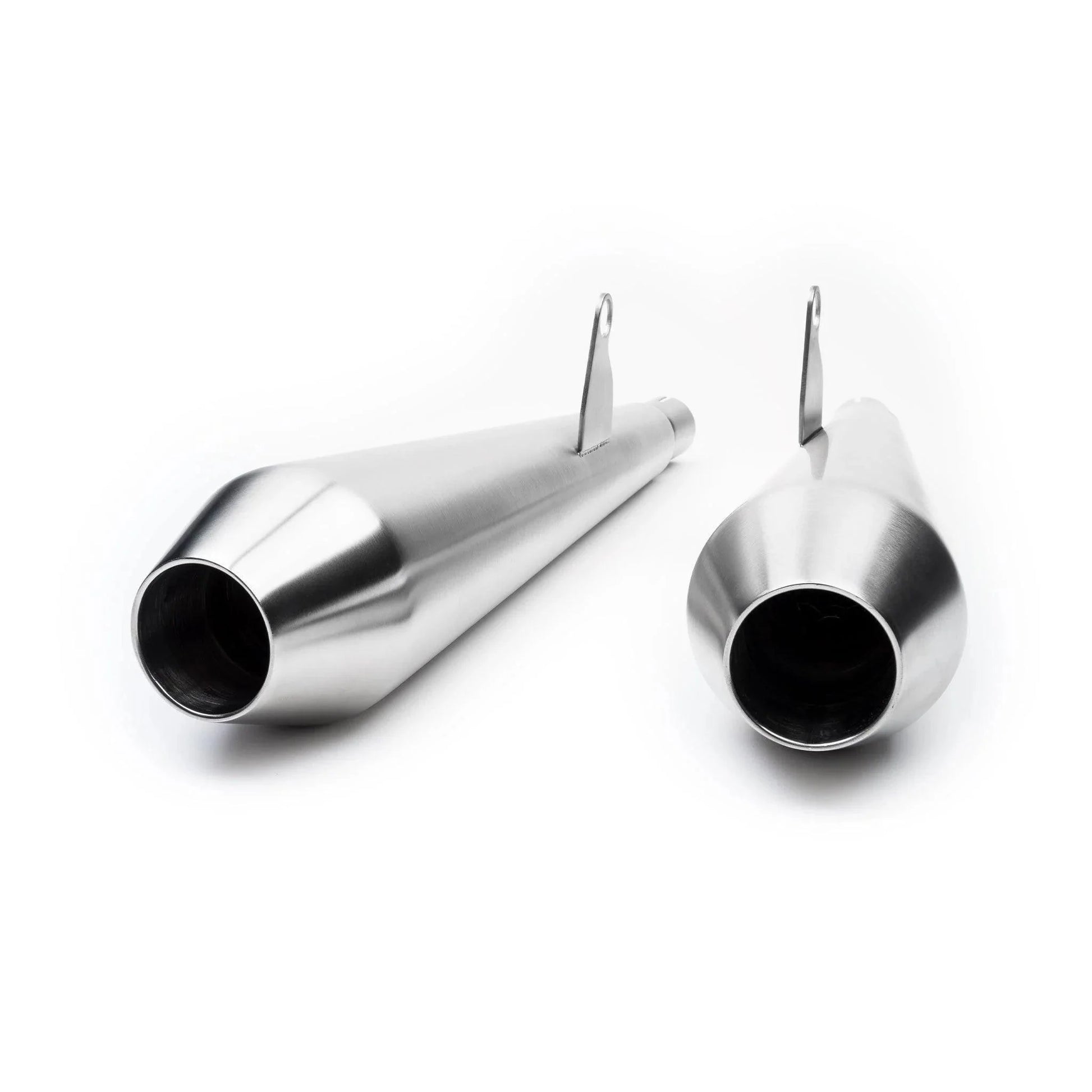 The reverse cone exhaust shape has been used since the 60s, tested through the years to have a unique way of sucking gasses out of the exhaust chambers and really boosting performance. We preserved this classic design for both its aesthetic and performance benefits, and combined it with our louvered baffle core to produce a vintage Triumph sound to match its retro look.