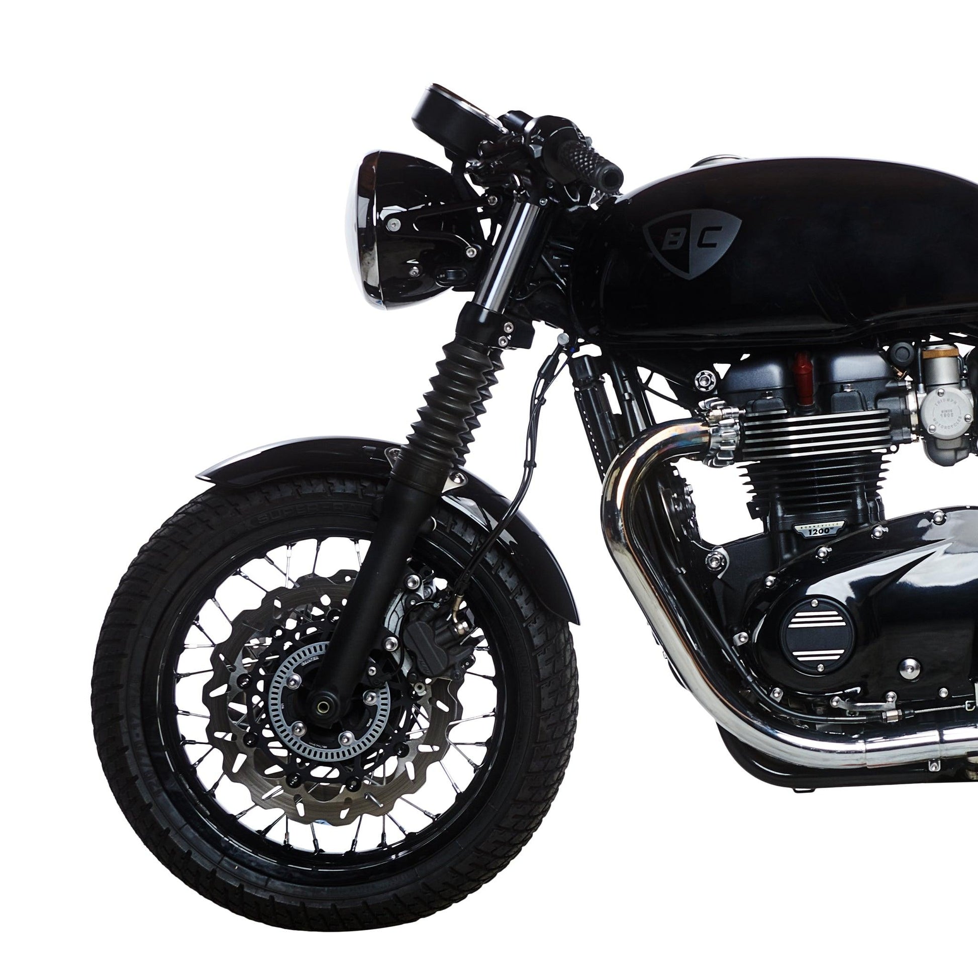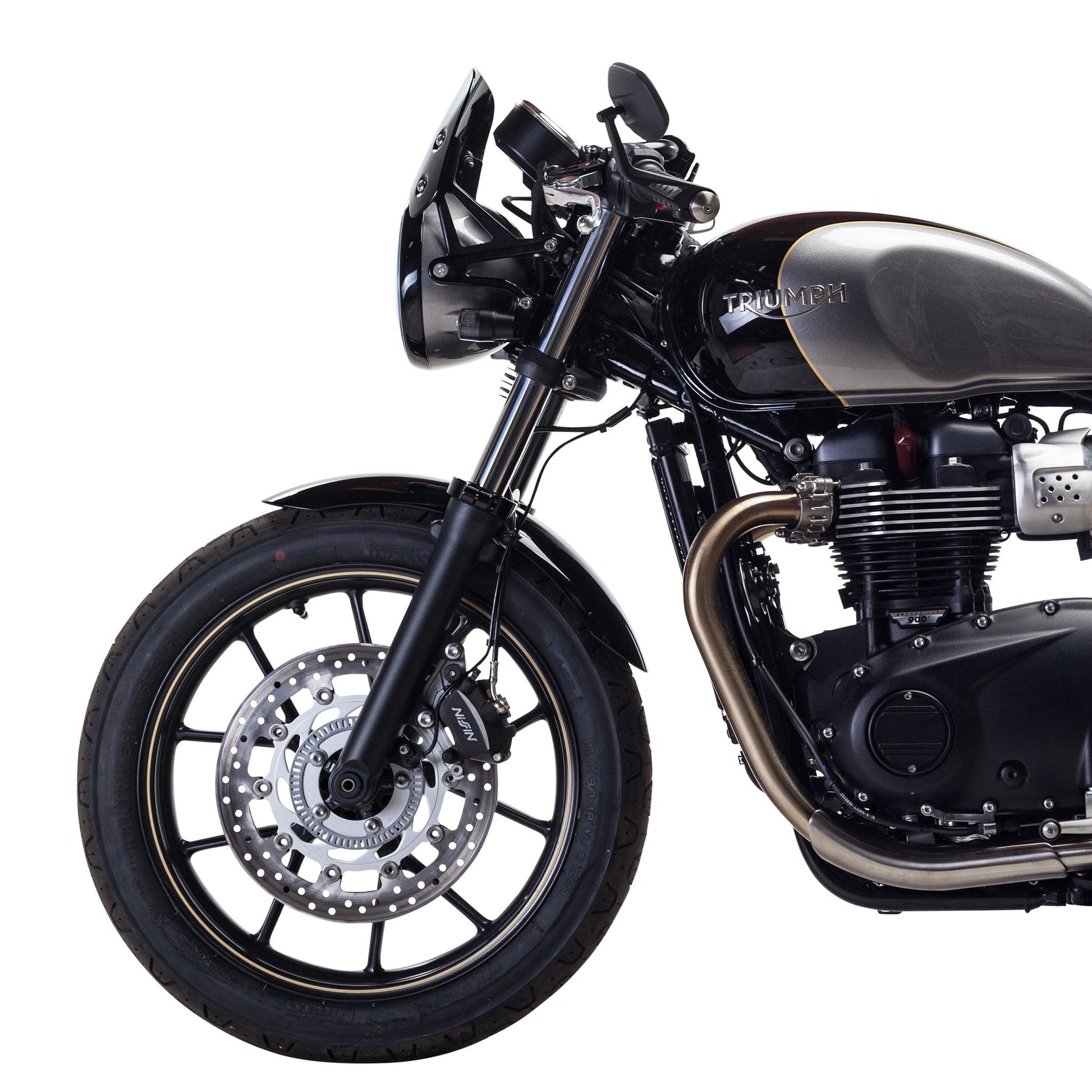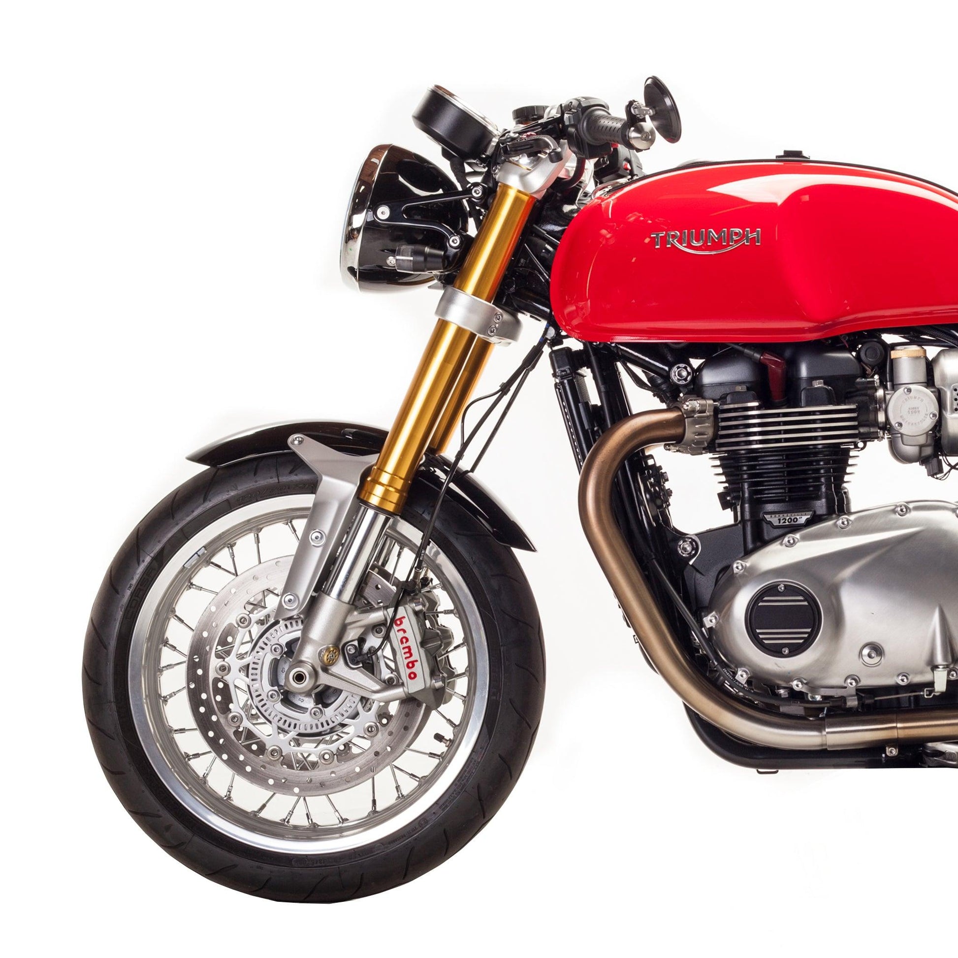 For the factory cafe style models such as Street Cup, Thruxton 1200/R/RS, and the roadster Speed Twin, we offer a direct factory replacement "Race Headlight Ears" which offer a billet aluminum upgrade over the cast stock ears. These are fixed location, and provide a custom look while maintaining the lines of the bike.