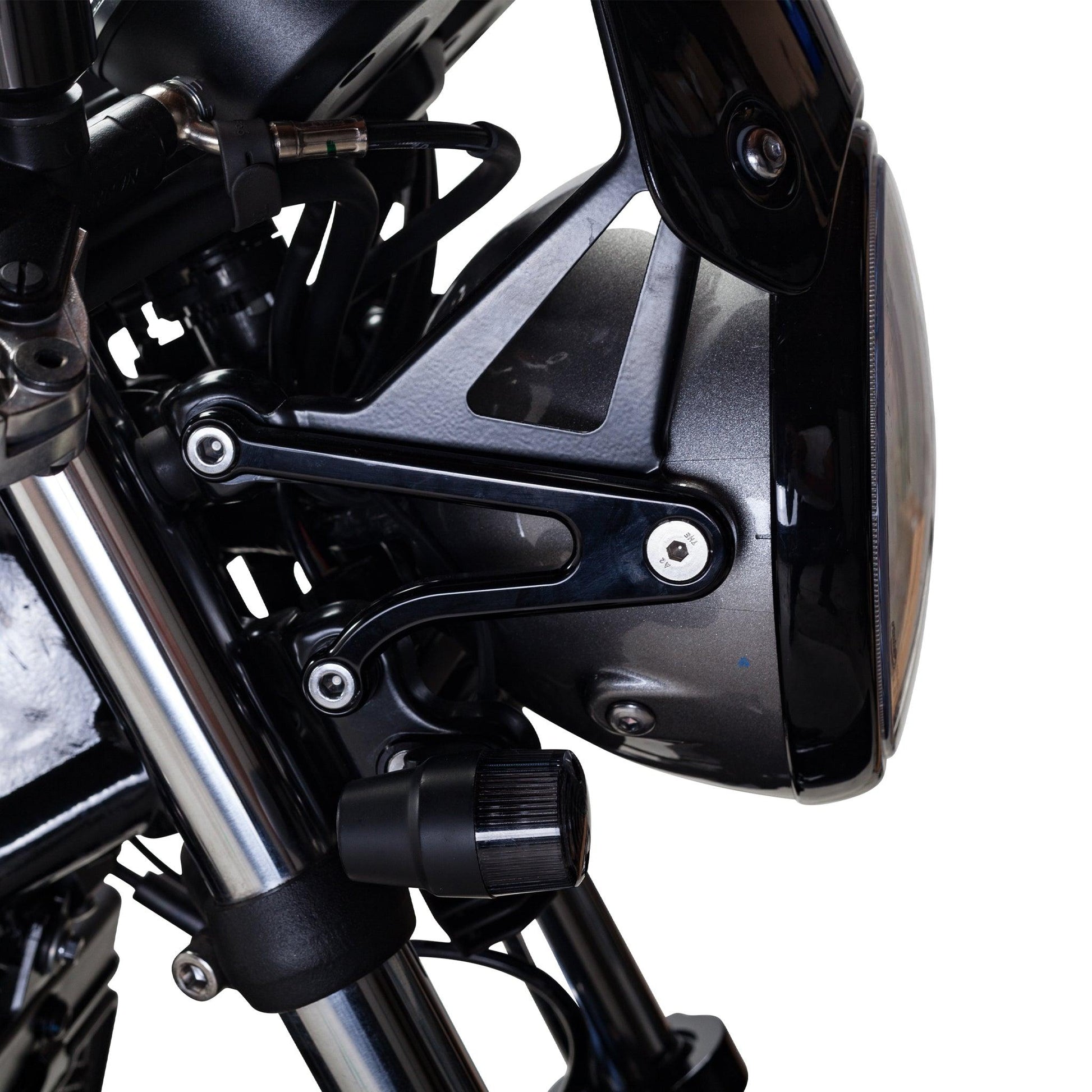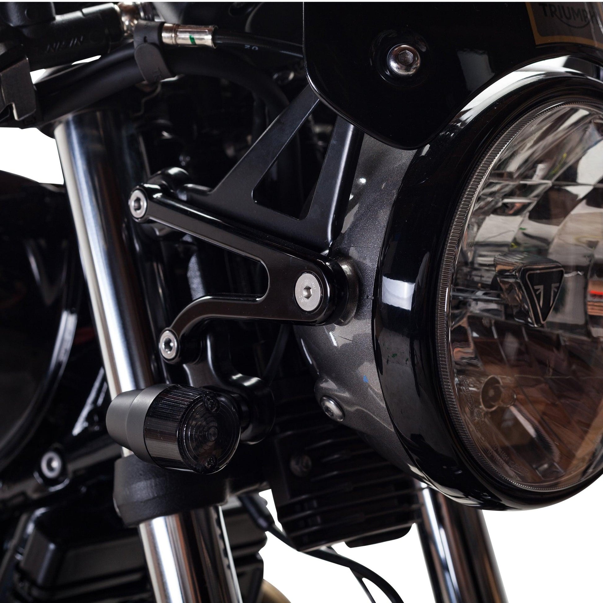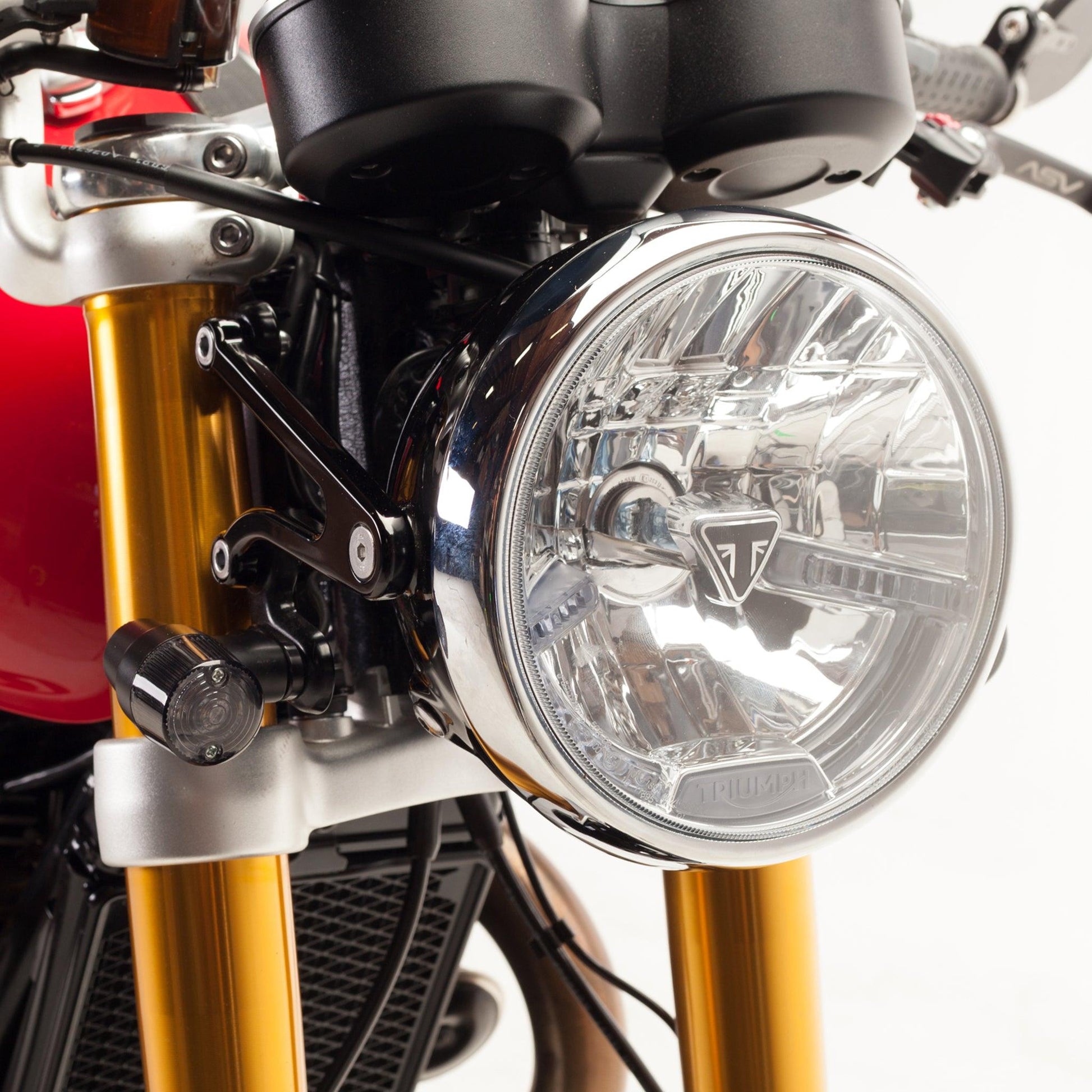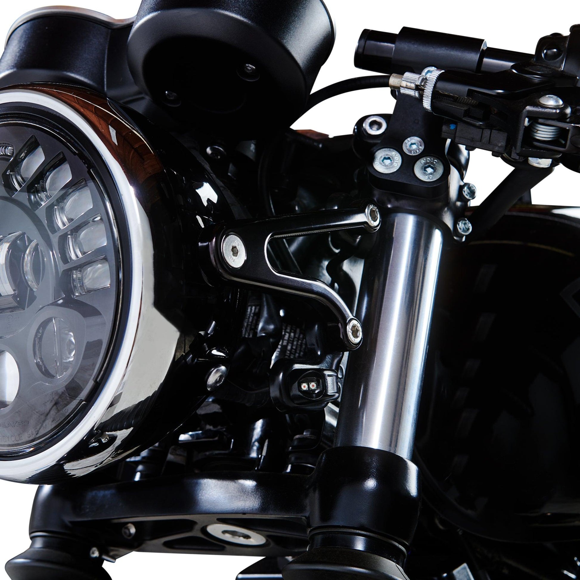 For the factory cafe style models such as Street Cup, Thruxton 1200/R/RS, and the roadster Speed Twin, we offer a direct factory replacement "Race Headlight Ears" which offer a billet aluminum upgrade over the cast stock ears. These are fixed location, and provide a custom look while maintaining the lines of the bike.