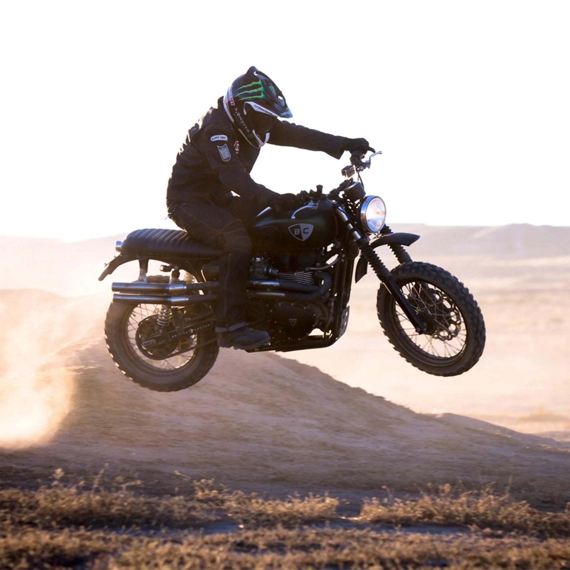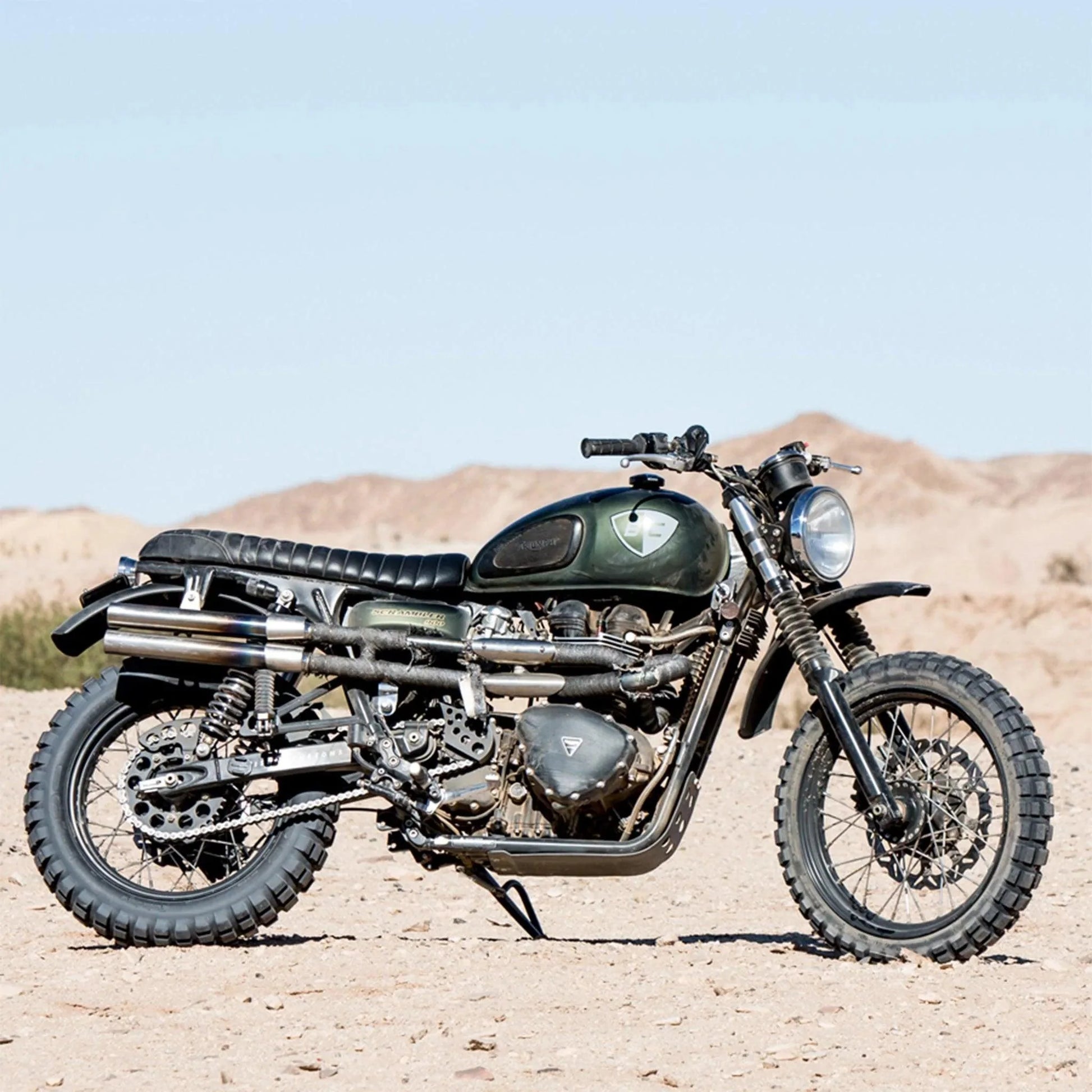 Unlike any other straight pipes on the market, this Triumph Scrambler exhaust offers boosted performance with a specially fitted louvered baffle wrapped in stainless steel wool to create the right amount of backpressure. Tried and true since 2012, this Scrambler exhaust pipe design has been tested by Ernie Virgil of Team Empire (see icon video) and most recently was tested on a Street Scrambler out in Ocotillo Wells, CA.