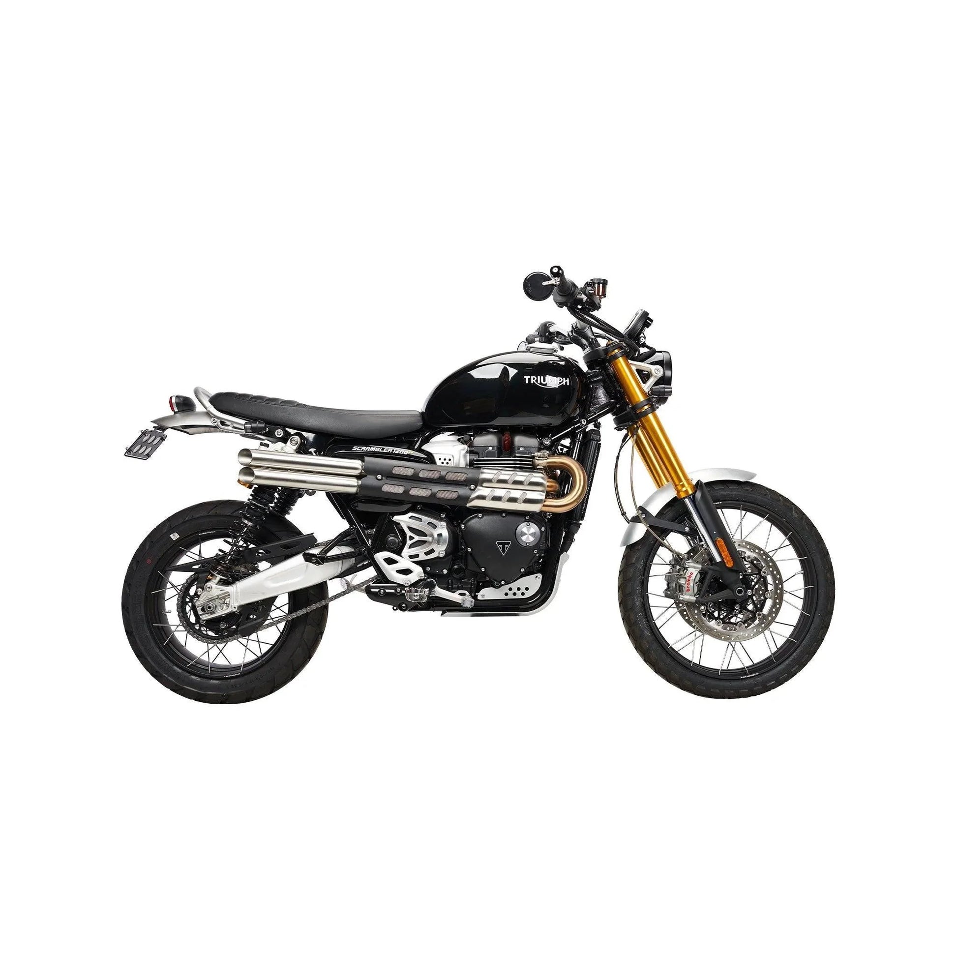 Designed to enhance your Triumph Scrambler 1200 XE and XC exhaust performance, this system optimizes airflow and back pressure, delivering superior throttle response and power efficiency. Inside the short, slash-cut ends, mechanical louver core baffles create a deep, aggressive tone without ever being noisy, adding a powerful resonance to your ride. Ideal for both the Triumph Scrambler 1200 XC and XE models, this exhaust not only boosts performance but also elevates the overall riding experience by improving ergonomics, especially for taller riders.
