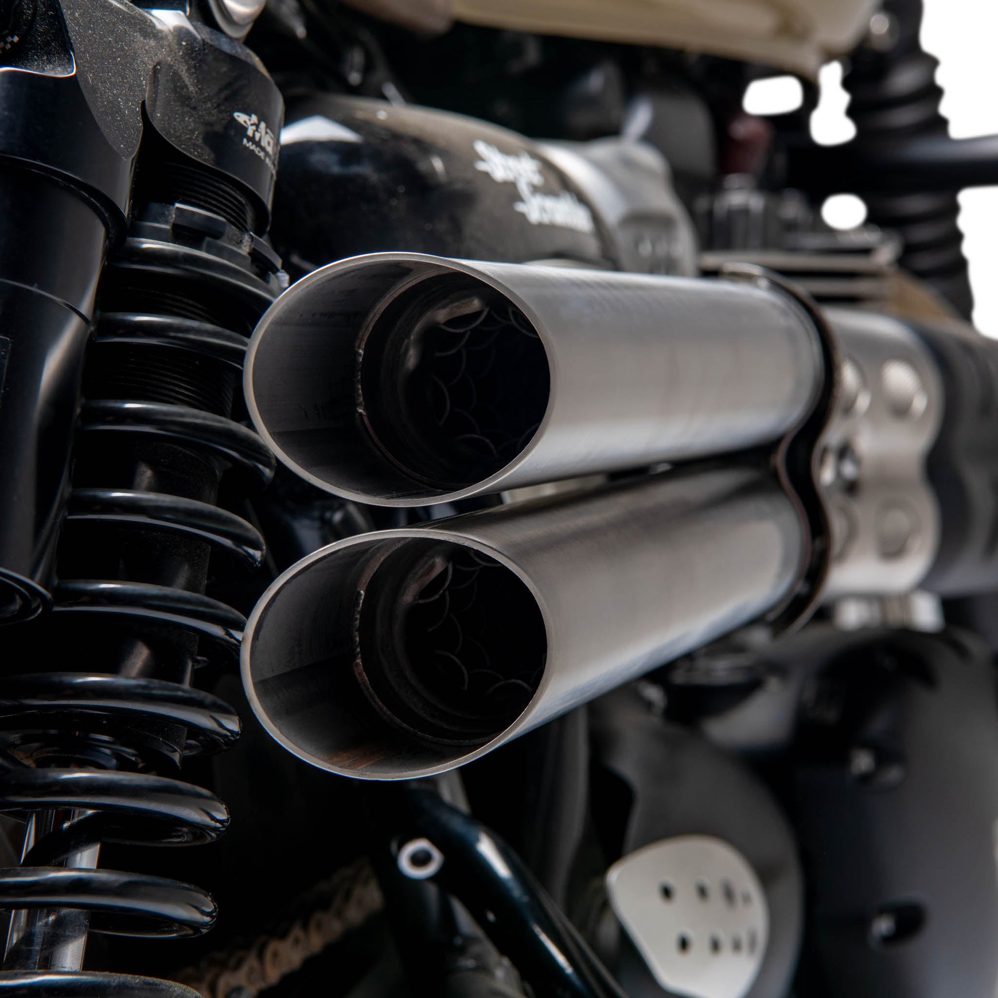The Guy Martin Great Escape Build inspired the Slash Cut Shotgun Exhaust. We took our best-selling Shotgun exhaust and shortened the exhaust body by cutting the ends at a 45-degree angle. The new shorter exhaust body required the original shotgun exhaust louver core to be replaced with a stainless steel perforated core baffle to maintain back pressure and give your Triumph Scrambler a sound that will have you grabbing the throttle more often.