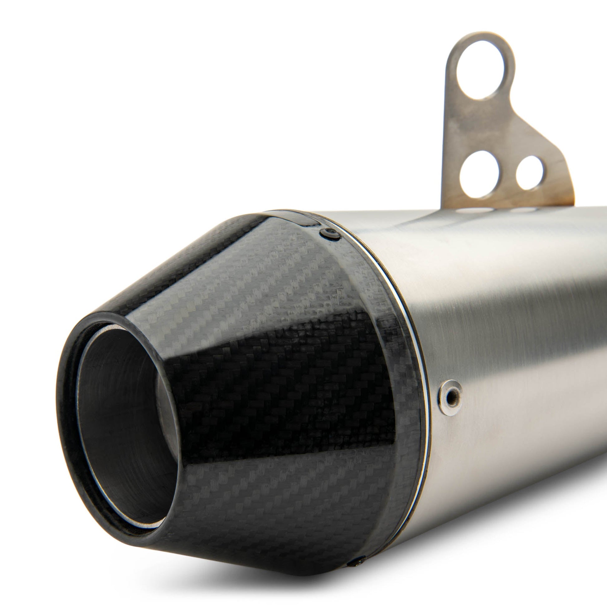 Built with 20-gauge 304 stainless steel, 6061 aluminum, and a carbon fiber end cap, this Triumph 400/400x exhaust is engineered for durability and weight reduction, bringing it down to just 3 lbs from the stock 7.85 lbs. That’s a huge performance boost, letting your Triumph shed unnecessary bulk and unleash its full potential.
